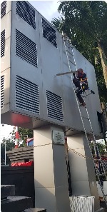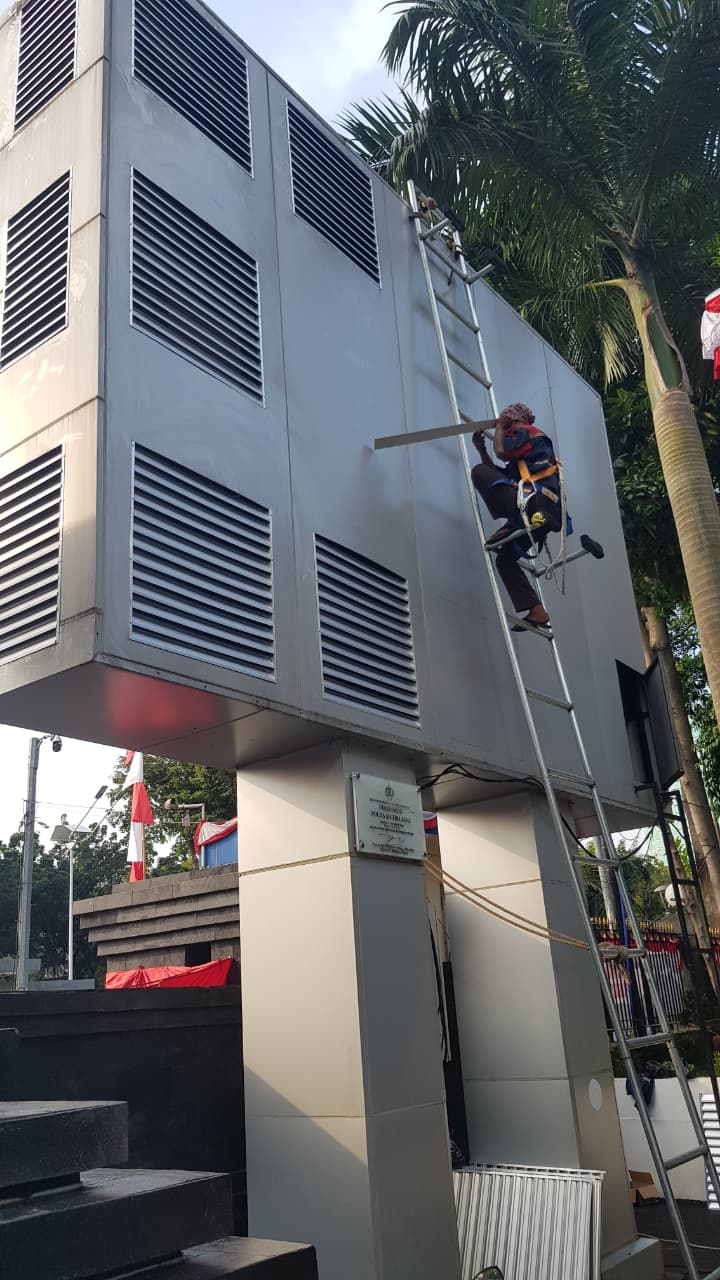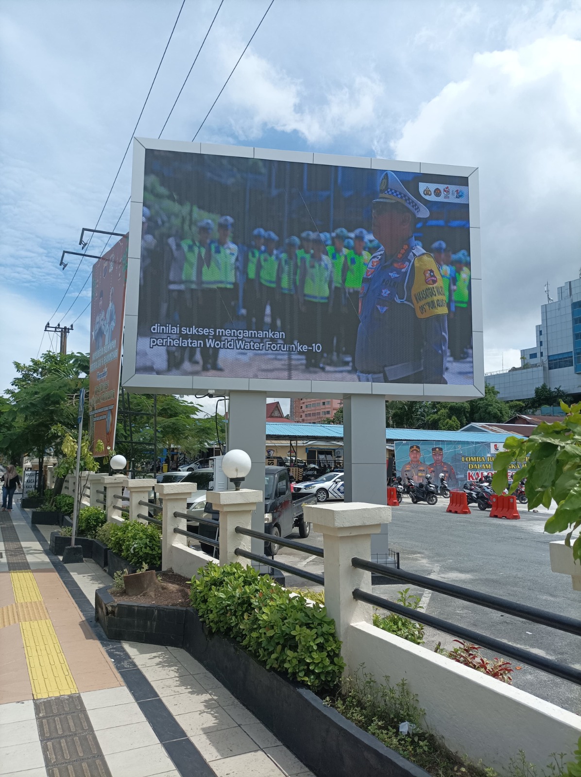 "Unit videotron yang terpasang di Polda Metro Jaya menggunakan panel LED outdoor dengan pitch P5. Seluruh proses perawatan meliputi pengecekan modul, power supply, sistem kontrol, struktur, serta performa brightness agar layar tetap stabil dan optimal untuk operasional harian."