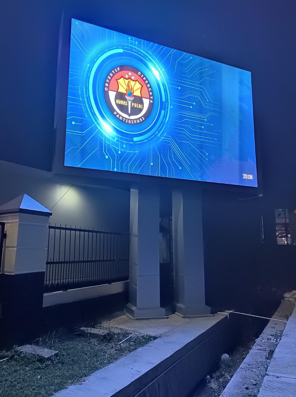 "Pemasangan videotron outdoor P5 di lingkungan Polda Kalimantan Timur dengan struktur tahan cuaca dan tingkat kecerahan tinggi. Layar digunakan untuk menampilkan informasi operasional dan publik, dengan sistem kontrol yang mudah dikelola dan stabil untuk pemakaian 24/7."